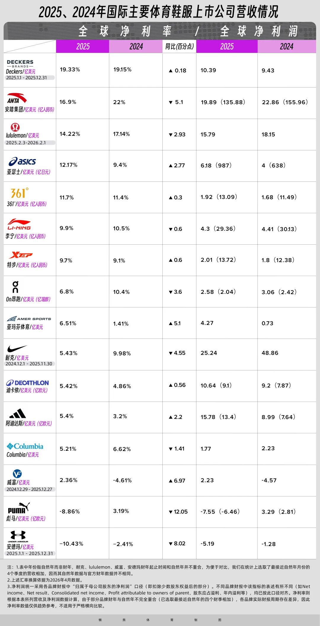 此次统计中,净利润大部分为归母净利润,净利率也通过将其除以营收得来。而因为耐克、威富、Deckers、安德玛四家为了更接近自然年的统计口径,将其各季度净利润计算得来,因而与其官方财年财报数据不同(因财年财报会有其他年度项目汇算的差异,可能存在较大差值),所以此处仅供做大方向上的参考。