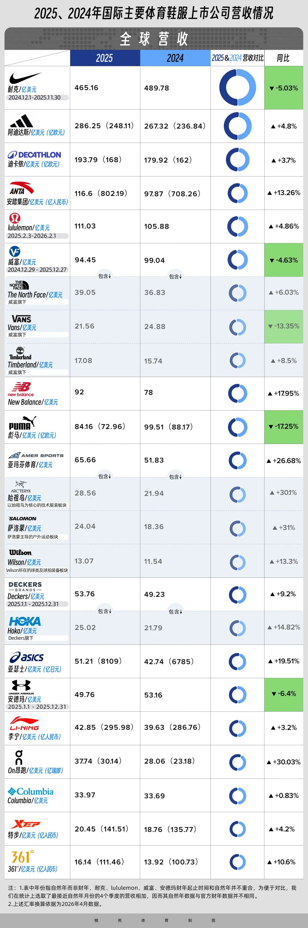 今年3-4月的公司财报季基本已落下帷幕。在全球经济复苏乏力、消费需求分化的背景下,运动鞋服行业的2025年成绩单依然展现韧性。跟过去几年一样,懒熊体育结合各家运动品牌的财报,以接近自然年的数据统计,呈现全球和中国市场在2025年过后的大致品牌份额和盈利情况。