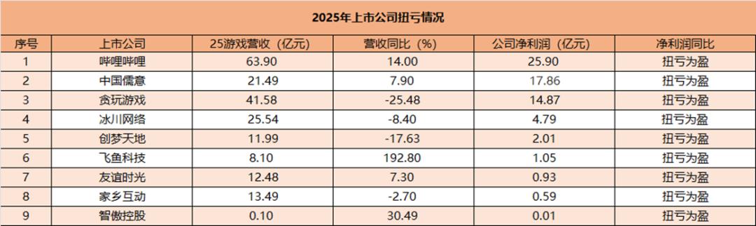 在统计榜单中,共有9家厂商扭亏为盈,打赢了翻身仗。除了已经提过的哔哩哔哩,像中国儒意、创梦天地、冰川网络都给出了不错的成绩单。