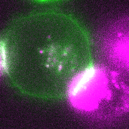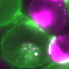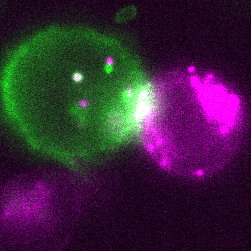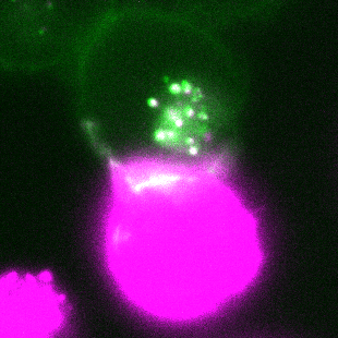 粉色细胞正在通过胞啃将红色荧光蛋白mCherry递送给绿色细胞丨受访者供图